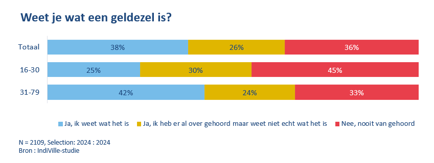 38% van de bevolking weet precies wat een geldezel is en 26% heeft er al eens van gehoord. Bij de 16-30-jarigen, weet slechts 1 op de 4 wat het fenomeen geldezels juist inhoudt en heeft 30% er al eens van gehoord.