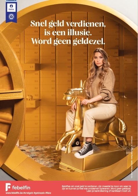 Voor de gelegenheid kruipen twee bekende Belgen (met heel wat volgers op social media) in de huid van een geldezel: de Antwerpse Liandra Sadzo en de Brusselse Sophie Maréchal. Ze vertellen in een video hoe de criminelen te werk gaan en wijzen op de nare gevolgen voor wie geldezel speelt. De boodschap: “Laat je niet verleiden om een geldezel te zijn. Snel geld verdienen is een illusie.”