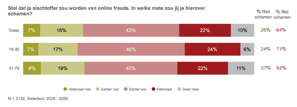 Online fraude treft jong en oud, maar erover praten blijkt allesbehalve vanzelfsprekend. 64% van de Belgen zou zich schamen als ze slachtoffer worden van online fraude, terwijl dat bij een woninginbraak slechts 20% is. Dat verschil vertaalt zich ook in gedrag: slechts 36% zou een online fraude-ervaring met een bredere kring delen, tegenover 60% bij een woninginbraak.