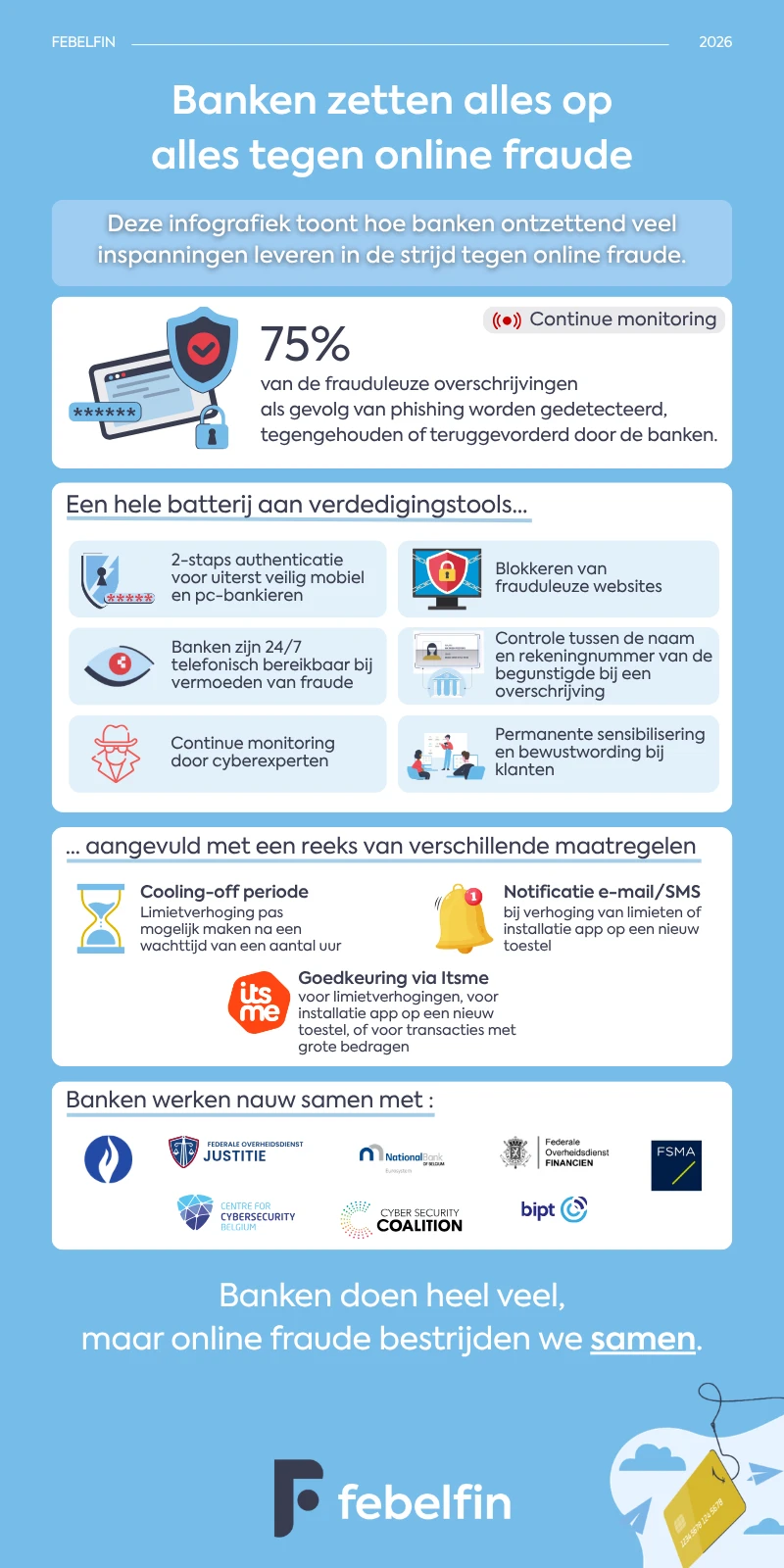 Alle banken doen continue aan monitoring van transacties op basis van algoritmen om verdachte transacties te detecteren. Op die manier wordt 75% van de ontvangen en ondertekende overschrijvingen naar aanleiding van phishing nog gedetecteerd, geblokkeerd of gerecupereerd door de banken. Bovendien is er een permanente uitwisseling van informatie tussen de banken over nieuwe modi operandi van criminelen, om zo hun detectie-algoritmen te kunnen aanpassen. Dit is een voortdurende oefening en een kat-en-muis spel met de fraudeurs. Daarenboven gebruiken banken vandaag allerhande extra beveiligingsinstrumenten om hun klanten te beschermen tegen fraude: van dag-; week- en transactielimieten bij overschrijvingen; wachttijden bij limietverhogingen; notificaties die worden verzonden bij limietverhogingen en installatie van apps; IBAN-naamcontrole bij overschrijvingen; 24/7 bereikbaarheid bij vermoeden van fraude, enz… Een heel arsenaal aan instrumenten wordt nu dus reeds ingezet om de klanten maximaal te beschermen.