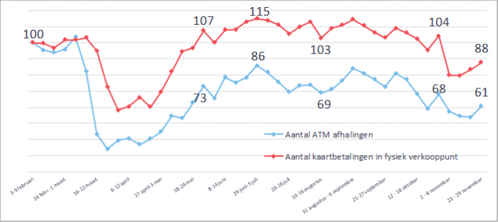 Vooral de contactloze betalingen zijn doorgebroken: in februari 2020 waren 16% van alle kaartbetalingen contactloos, terwijl op vandaag maar liefst bijna de helft van alle kaartbetalingen (47%) contactloos verlopen! Het optrekken van de limieten voor contactloos betalen en de toenemende vraag van de handelaars om met de kaart te betalen omwille van hygiënische redenen, heeft daar zeker toe bijgedragen.