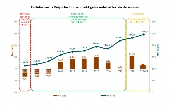 De Belgische fondsensector kende tijdens het eerste kwartaal van 2021 een stijging van 6,4 % en dit, grosso modo, voor 70 % door toedoen van koerswinsten opgetekend door de onderliggende activa en voor 30 % door netto inschrijvingen. Eind maart 2021 bedroeg het netto actief van de in België publiek verdeelde fondsen 246,6 miljard EUR.