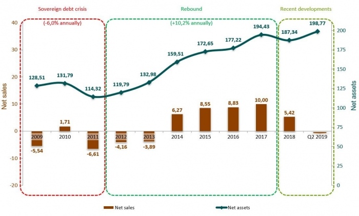 De Belgische fondsensector kende tijdens het tweede kwartaal van 2019 een stijging van 4,6 % door toedoen van koerswinsten opgetekend door de onderliggende activa. Eind juni 2019 bedroeg het netto actief van de in België publiek verdeelde fondsen 198,8 miljard EUR.