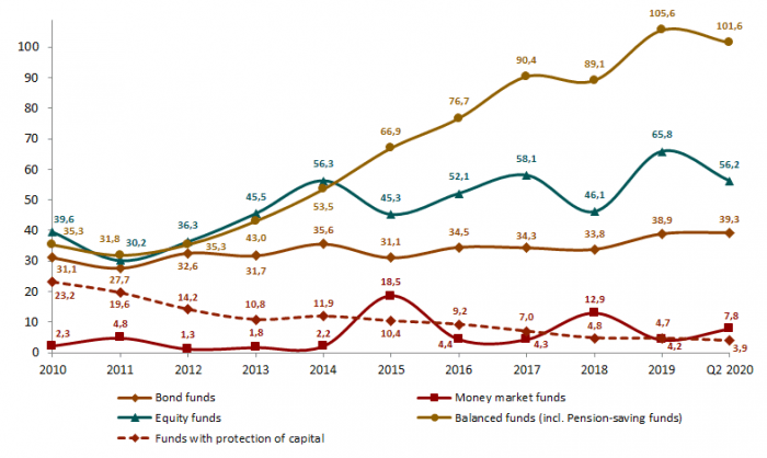 Het netto actief van de fondsen die hoofdzakelijk beleggen in vastrentende effecten noteerde een stijging van 4,5 % gedurende het tweede trimester van 2020. Het netto actief van de fondsen die hoofdzakelijk beleggen in niet-vastrentende effecten, zoals gemengde fondsen en aandelenfondsen, steeg tijdens deze periode met 10,9 %.