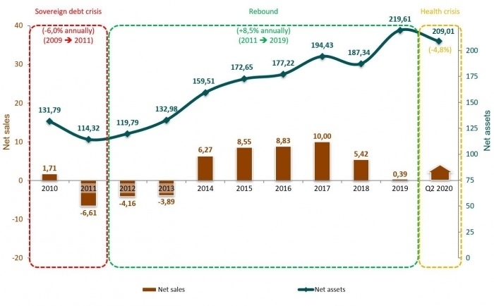 Eind juni 2020 bedroeg het netto actief van de in België publiek verdeelde fondsen 209,0 miljard EUR. Tijdens het tweede trimester werd reeds meer dan 60 % gerecupereerd van de daling die zich voordeed tijdens het eerste kwartaal van 2020 ten gevolge van de impact van de Covid-19 pandemie.