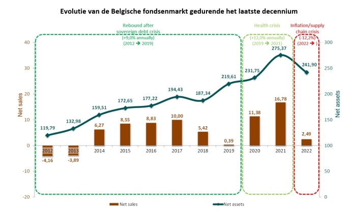 Eind 2021 bedroeg het netto actief van de in België publiek verdeelde fondsen 275,4 miljard EUR. De Belgische fondsensector kende gedurende de eerste negen maanden van 2022 in alle kwartalen een terugval van het netto actief door toedoen van koersverliezen opgetekend door de onderliggende activa, ondanks dat er in elk trimester netto inschrijvingen waren. In het laatste kwartaal van 2022 trad er echter een heropleving op door toedoen van koerswinsten opgetekend door de onderliggende activa, dewelke enigszins werd afgezwakt door netto terugbetalingen tijdens deze periode.