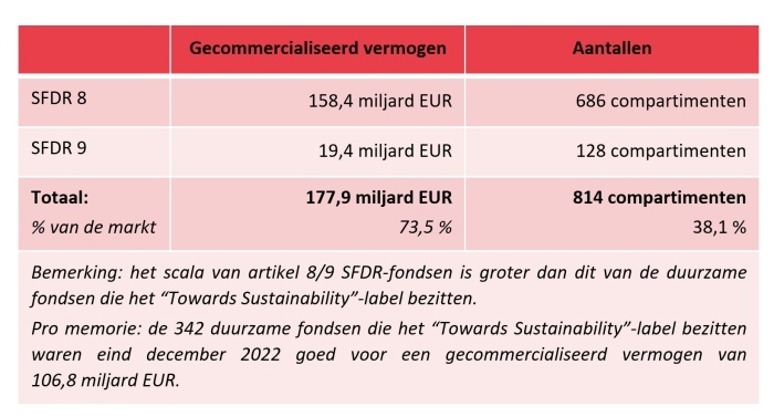 Onderstaande tabel geeft een overzicht van de verspreiding van duurzame fondsen in België en dit per einde december 2022.