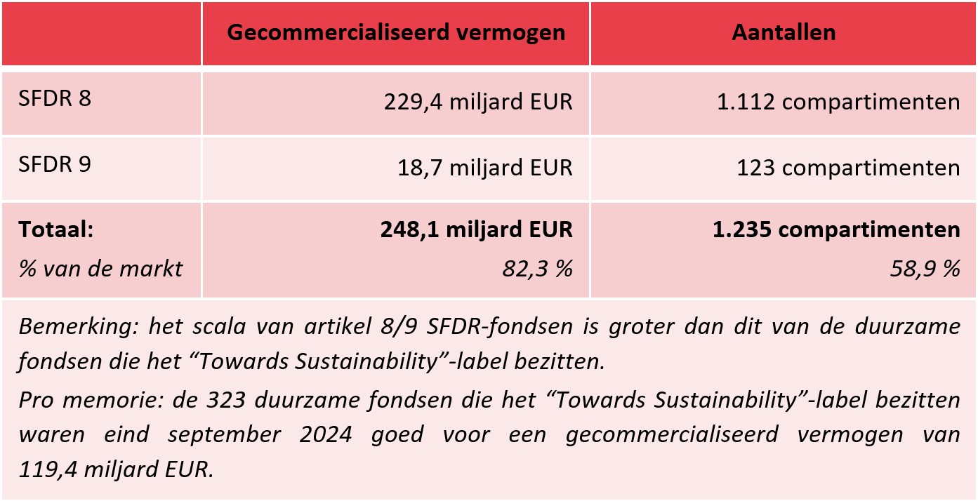 Onderstaande tabel geeft een overzicht van de spreiding van de duurzame fondsen (volgens de SFDR-classificatie) in België en dit per eind september 2024: