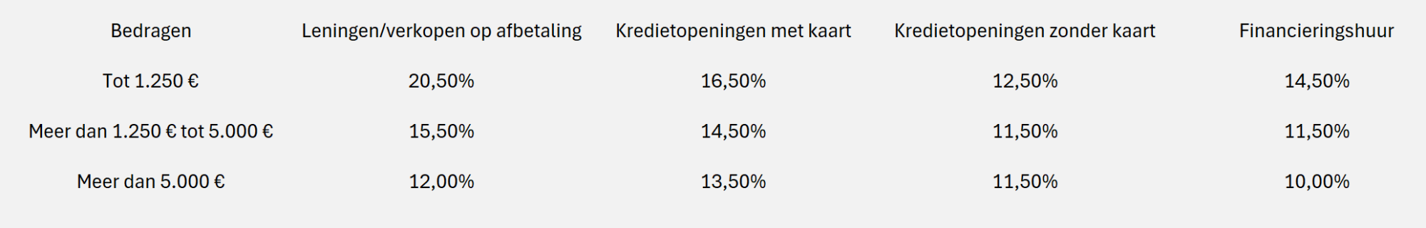 Het is nuttig om weten dat in de wet maximale kostenpercentages (JKP) zijn bepaald die de kredietgevers niet mogen overschrijden en waarboven het verboden is krediet te verstrekken. Die kostenpercentages worden periodiek herzien op basis van de evolutie van de geldmarkt.